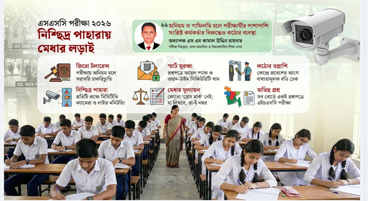 স্টাফ রিপোটার: আসন্ন মাধ্যমিক স্কুল সার্টিফিকেট (এসএসসি) ও সমমান পরীক্ষা-২০২৬ সুষ্ঠু, স্বচ্ছ ও নকলমুক্ত পরিবেশে আয়োজনের লক্ষ্যে প্রত্যেক কক্ষে থাকবে সিসি ক্যামেরা। একই সঙ্গে ডিজিটাল ট্র্যাকিং, সিসিটিভি নজরদারি এবং প্রশ্নপত্রের ত্রিস্তরীয় নিরাপত্তার মধ্য দিয়ে অনুষ্ঠিত হতে যাচ্ছে এবারের পাবলিক পরীক্ষা। এই নীতির আওতায় শুধু পরীক্ষার্থীরাই নয়, কোনো ধরনের অনিয়ম প্রমাণিত হলে দায়িত্বরত কর্মকর্তাদের চাকরিচ্যুতির মতো কঠোর হুঁশিয়ারি দেওয়া হয়েছে। সংশ্লিষ্টরা বলছেন, পরীক্ষার প্রস্তুতির ক্ষেত্রে সরকার কোনো ধরনের ছাড় দিচ্ছে না। সেই সঙ্গে শিক্ষামন্ত্রীও স্পষ্ট জানিয়ে দিয়েছেন, এবার খাতায় কোনো ধরনের ‘গ্রেস মার্ক’ বা অনুকম্পার সুযোগ থাকবে না; শিক্ষার্থীরা যা লিখবে, তার ভিত্তিতেই প্রকৃত নম্বর প্রদান করা হবে। মেধার এই লড়াইকে স্বচ্ছ করতে প্রতিটি পরীক্ষা কেন্দ্রকে আনা হচ্ছে সিসিটিভি ক্যামেরার কঠোর নজরবন্দিতে। শুধু ক্যামেরা স্থাপনই নয়, ধারণকৃত ফুটেজ প্রতি সাত দিন অন্তর সংশ্লিষ্ট শিক্ষা বোর্ডে পাঠানোর নির্দেশ দেওয়া হয়েছে। এছাড়া, প্রশ্নপত্র সুরক্ষায় এবার প্রযুক্তির সর্বোচ্চ ব্যবহার নিশ্চিত করা হচ্ছে। বিজি প্রেস থেকে প্রশ্নগুলো প্রথমে বিশেষ ‘ফয়েল প্যাকে’ এবং পরবর্তীতে একটি ‘ওয়ান টাইম’ সিকিউরিটি খামে ভরা হচ্ছে। এই খামটি এমনভাবে তৈরি যে, একবার খোলা হলে তা আর পুনরায় লাগানো সম্ভব নয়। ট্রেজারি থেকে প্রশ্ন কেন্দ্রে নেওয়ার সময় একজন ট্যাগ অফিসার সার্বক্ষণিক উপস্থিত থাকবেন এবং পরীক্ষা শুরুর মাত্র ১৫ থেকে ২০ মিনিট আগে সবার উপস্থিতিতে খাম খোলা হবে। ফলে প্রশ্ন ফাঁসের চিরাচরিত ছিদ্রপথগুলো এবার পুরোপুরি বন্ধ হতে যাচ্ছে। পরীক্ষা কেন্দ্রের শৃঙ্খলা বজায় রাখতে এবার পরীক্ষার্থীদের ওপর থাকছে কঠোর বিধিনিষেধ। কোনো পরীক্ষার্থীই নিজ প্রতিষ্ঠানে পরীক্ষা দিতে পারবে না। কেন্দ্রে প্রবেশের আগে প্রতিটি শিক্ষার্থীকে নিবিড় ‘নিরাপত্তা চেক’ পার হতে হবে। পরীক্ষার্থীদের দেহ তল্লাশি করে ভেতরে প্রবেশের অনুমতি দেওয়া হবে; নারী পরীক্ষার্থীদের তল্লাশির জন্য নারী শিক্ষকের উপস্থিতি বাধ্যতামূলক করা হয়েছে। এছাড়া, কেন্দ্রসচিব ব্যতীত অন্য কোনো শিক্ষক বা কর্মকর্তা পরীক্ষা কেন্দ্রে মোবাইল ফোন ব্যবহার করতে পারবেন না। সাইবার নজরদারি ও গুজব রোধ: পরীক্ষার আগে গুজব ও ডিজিটাল জালিয়াতি রুখতে সাইবার নজরদারি কয়েক গুণ বাড়ানো হয়েছে। প্রশ্ন ফাঁসের গুজব ছড়িয়ে যারা সাধারণ শিক্ষার্থী ও অভিভাবকদের বিভ্রান্ত করার চেষ্টা করবে, তাদের বিরুদ্ধে তাৎক্ষণিক জেল- জরিমানাসহ কঠোর আইনি ব্যবস্থা নেওয়ার নির্দেশ দেওয়া হয়েছে। সামাজিক যোগাযোগমাধ্যমগুলো