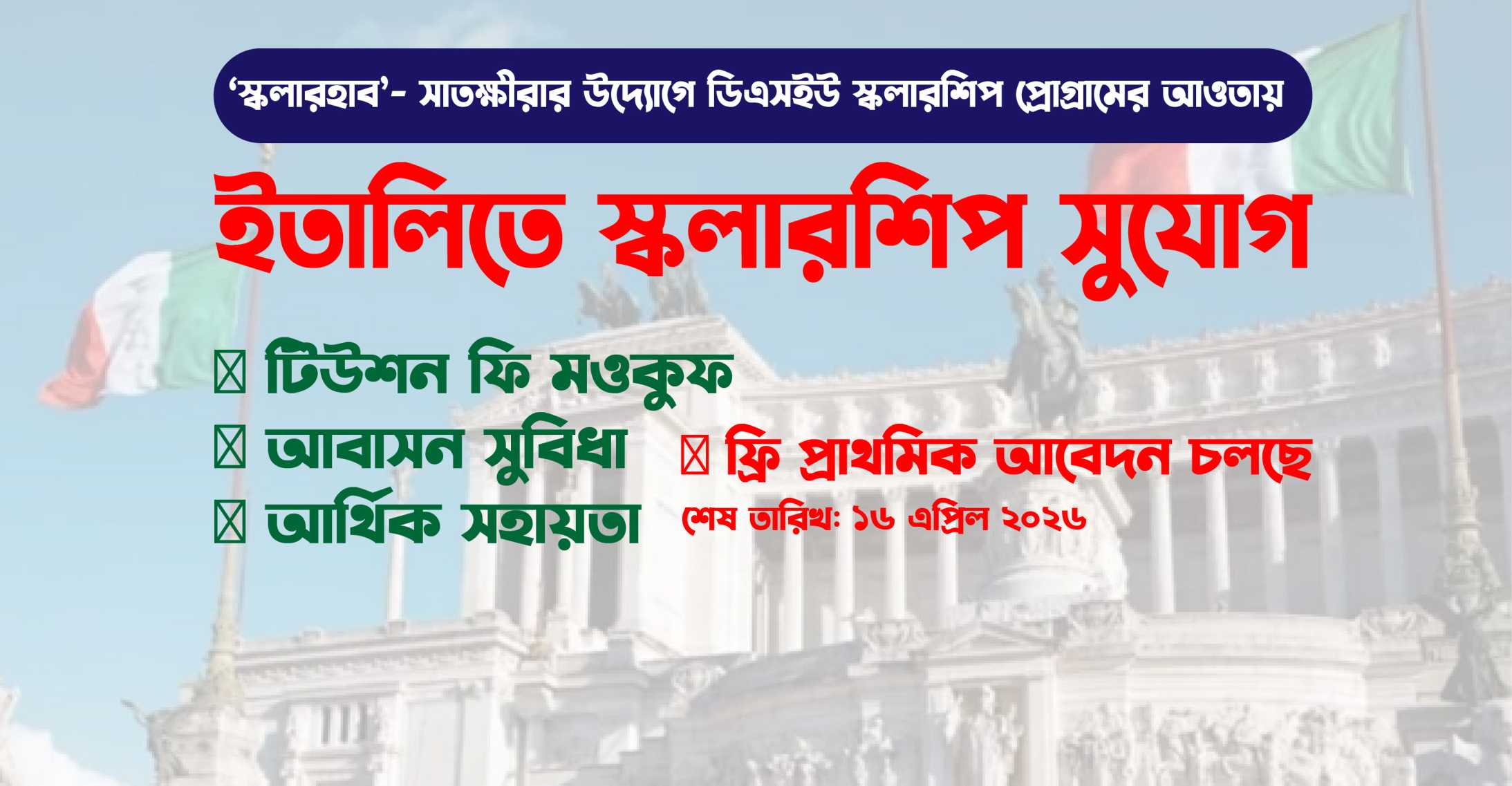 সাতক্ষীরা ভিত্তিক প্রতিষ্ঠান স্কলারহাব-এর উদ্যোগে ইতালির পাবলিক বিশ্ববিদ্যালয়ে DSU Scholarship Programme-এর আওতায় উচ্চশিক্ষার সুযোগ প্রদান করা হচ্ছে।