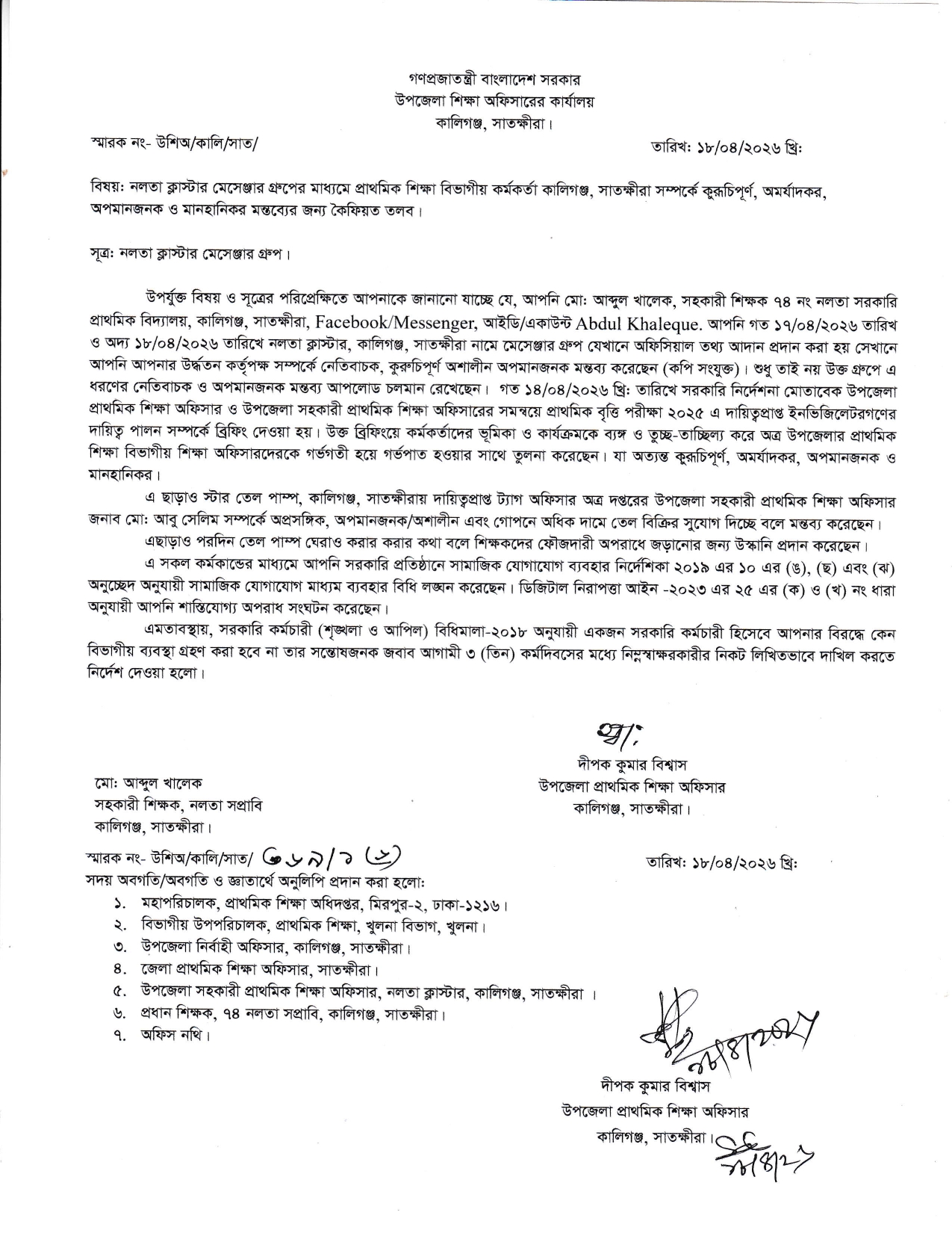 স্টাফ রিপোর্টার: সাতক্ষীরার কালিগঞ্জে সামাজিক যোগাযোগ মাধ্যমে (মেসেঞ্জার গ্রুপে) ঊর্ধ্বতন কর্মকর্তাদের নিয়ে কুরুচিপূর্ণ ও মানহানিকর মন্তব্য করার অভিযোগে এক সহকারী শিক্ষককে কারণ দর্শানোর নোটিশ (শোকজ) দেওয়া হয়েছে। তিন কর্মদিবসের মধ্যে লিখিত জবাব দিতে বলা হয়েছে তাঁকে। উপজেলা প্রাথমিক শিক্ষা কর্মকর্তার কার্যালয় সূত্রে জানা যায়, অভিযুক্ত শিক্ষক মো. আব্দুল খালেক উপজেলার ৭৪ নম্বর নলতা সরকারি প্রাথমিক বিদ্যালয়ের সহকারী শিক্ষক। তিনি ‘নলতা ক্লাস্টার, কালিগঞ্জ’ নামের একটি মেসেঞ্জার গ্রুপে গত ১৭ ও ১৮ এপ্রিল একাধিক পোস্টে ঊর্ধ্বতন কর্মকর্তাদের সম্পর্কে কুরুচিপূর্ণ, অমর্যাদকর ও অপমানজনক মন্তব্য করেন বলে অভিযোগ করা হয়েছে। ওই গ্রুপটি সরকারি তথ্য আদান-প্রদানের জন্য ব্যবহৃত হয়। নোটিশে উল্লেখ করা হয়, গত ১৪ এপ্রিল প্রাথমিক বৃত্তি পরীক্ষা-২০২৫ উপলক্ষে দায়িত্বপ্রাপ্ত ইনভিজিলেটরদের ব্রিফিংয়ে কর্মকর্তাদের ভূমিকা নিয়ে ব্যঙ্গ ও তুচ্ছতাচ্ছিল্য করে আপত্তিকর মন্তব্য করেন ওই শিক্ষক। পাশাপাশি কালিগঞ্জের একটি তেল পাম্পে দায়িত্বপ্রাপ্ত ট্যাগ কর্মকর্তার বিরুদ্ধেও অপ্রাসঙ্গিক ও অপমানজনক মন্তব্য করেন এবং তেল পাম্প ঘেরাওয়ের আহ্বান জানান, যা শিক্ষকদের ফৌজদারি অপরাধে প্ররোচিত করার শামিল বলে নোটিশে উল্লেখ করা হয়েছে। এতে বলা হয়, এসব কর্মকাণ্ড সরকারি প্রতিষ্ঠানে সামাজিক যোগাযোগমাধ্যম ব্যবহার নির্দেশিকা-২০১৯ লঙ্ঘনের শামিল। পাশাপাশি ডিজিটাল নিরাপত্তা আইন-২০২৩ অনুযায়ীও তা শাস্তিযোগ্য অপরাধ হতে পারে। উপজেলা প্রাথমিক শিক্ষা কর্মকর্তা দীপক কুমার বিশ্বাস স্বাক্ষরিত নোটিশে বলা হয়েছে, সরকারি কর্মচারী (শৃঙ্খলা ও আপিল) বিধিমালা-২০১৮ অনুযায়ী কেন তাঁর বিরুদ্ধে বিভাগীয় ব্যবস্থা নেওয়া হবে না- সে বিষয়ে সন্তোষজনক জবাব তিন কর্মদিবসের মধ্যে দাখিল করতে হবে। এ বিষয়ে অভিযুক্ত শিক্ষক মো. আব্দুল খালেকের বক্তব্য জানতে তাঁর সঙ্গে যোগাযোগের চেষ্টা করা হলেও তাৎক্ষণিকভাবে তাঁকে পাওয়া যায়নি।